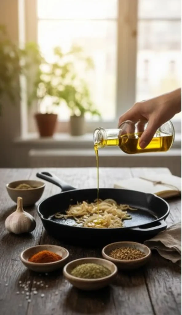 Un oignon fondu patiemment, une gousse d’ail maîtrisée, une huile ajoutée au moment juste :
