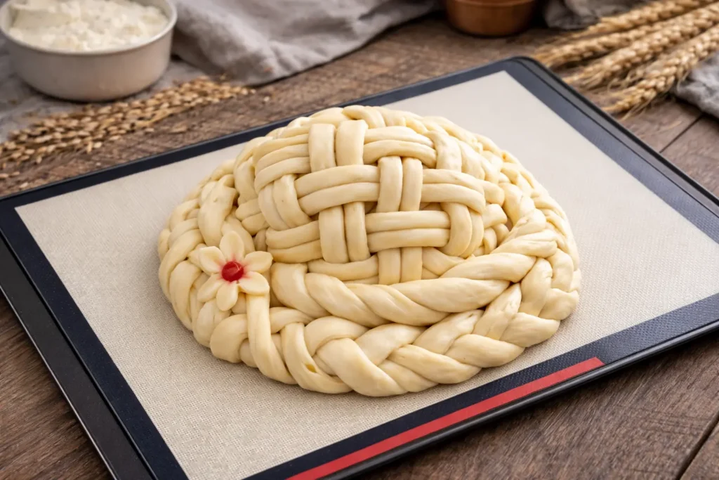 Cette tresse se pose tout autour de la boule comme une couronne. Elle encadre le pain et renforce l’aspect décoratif tout en laissant la pâte respirer.