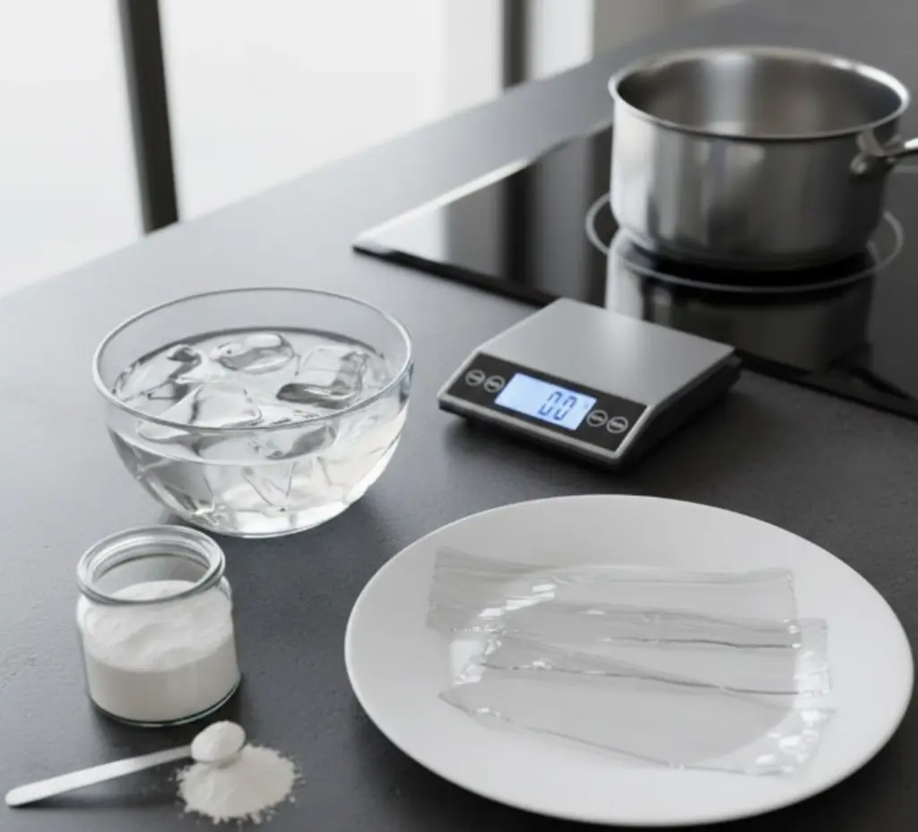 ⚖️ Mélanger 1 g de gélatine en poudre avec 5 g d’eau froide.