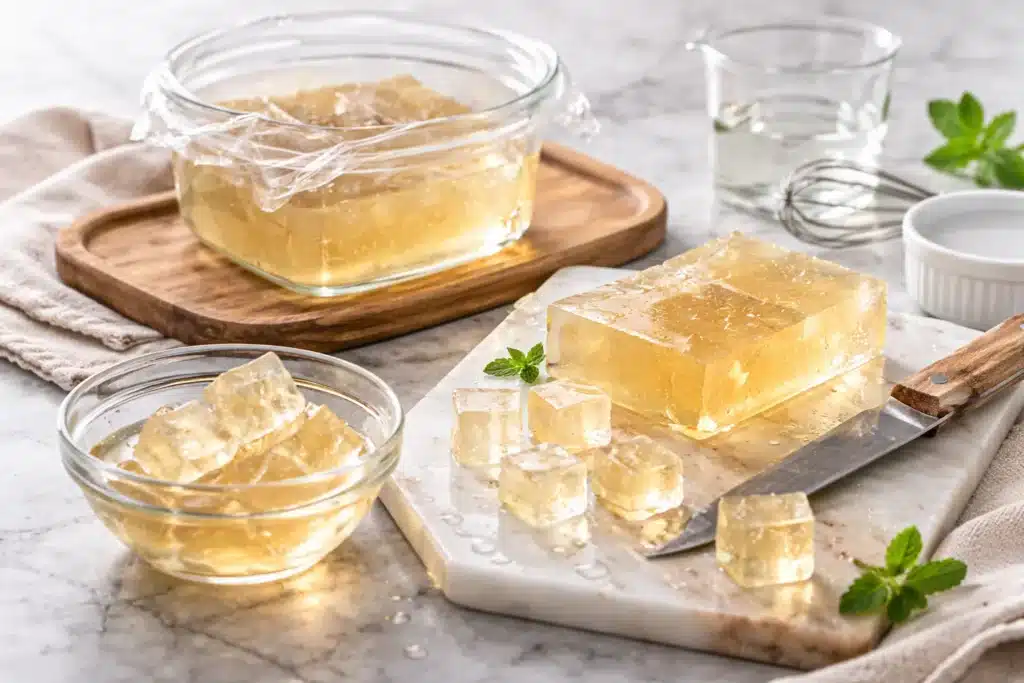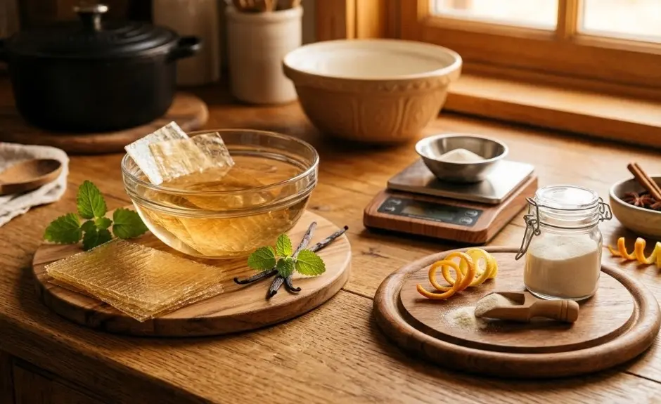 La gélatine étant neutre, elle peut devenir un support discret d’arômes. Il est possible d’utiliser une eau légèrement infusée pour apporter une note subtile à la préparation : thé léger, zeste d’orange, citron doux, verveine ou fleur d’oranger.