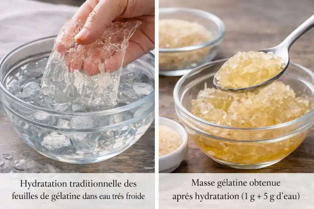 | Gélatine en feuilles | 1 feuille standard = 2 g (poids sec) | Base de calcul |