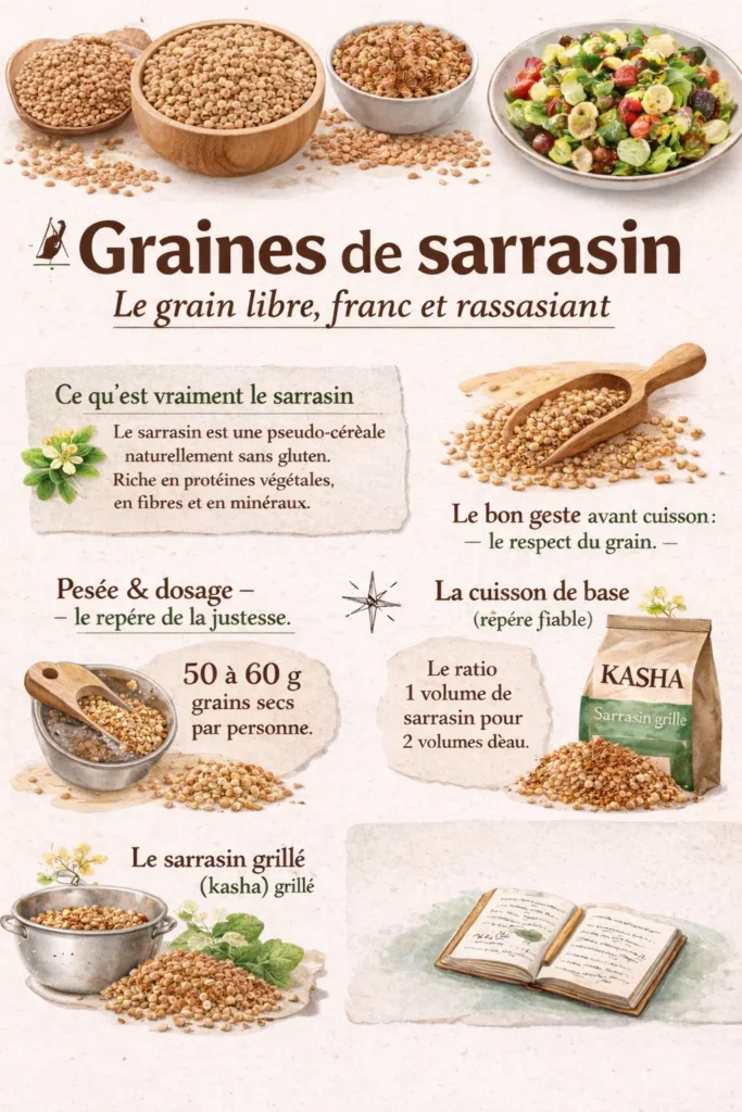 • Le sarrasin est souvent meilleur légèrement tiédi : les arômes de noisette s’expriment davantage qu’à température brûlante.