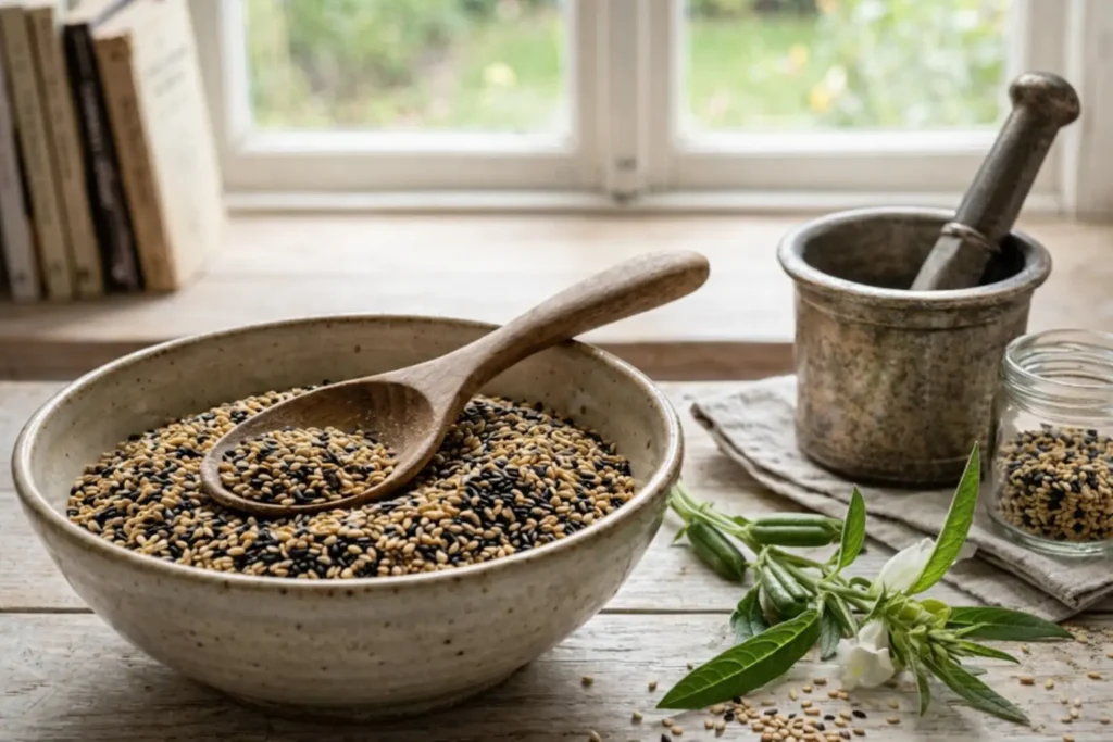 La graine de sésame révèle toute sa richesse lorsqu’elle est comprise dans son ensemble : matière oléagineuse, geste de torréfaction et usage précis en cuisine.