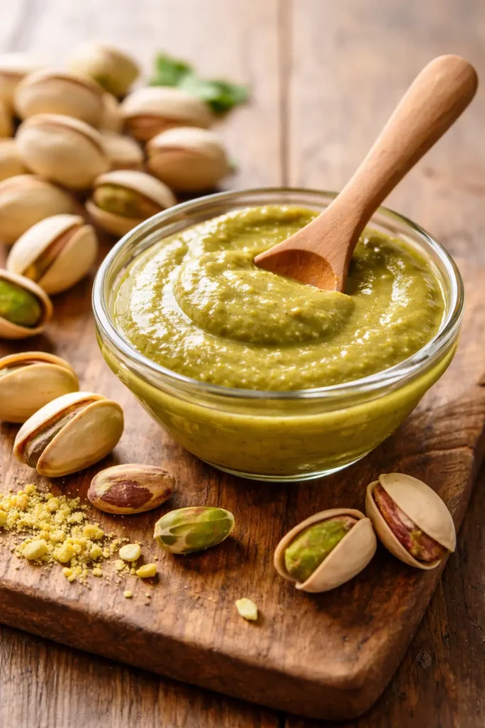 Mixée, elle permet également de réaliser de la pâte ou de la purée de pistache, utilisée pour parfumer crèmes, desserts et préparations pâtissières.