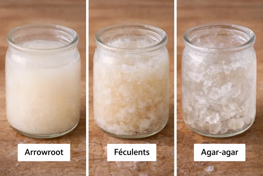 | Arrow-root | Amidon fin | 4 g | 8 g | Fragile à l’ébullition prolongée | Lisse, souple, brillante | Intéressant par son faible dosage | Excellente |