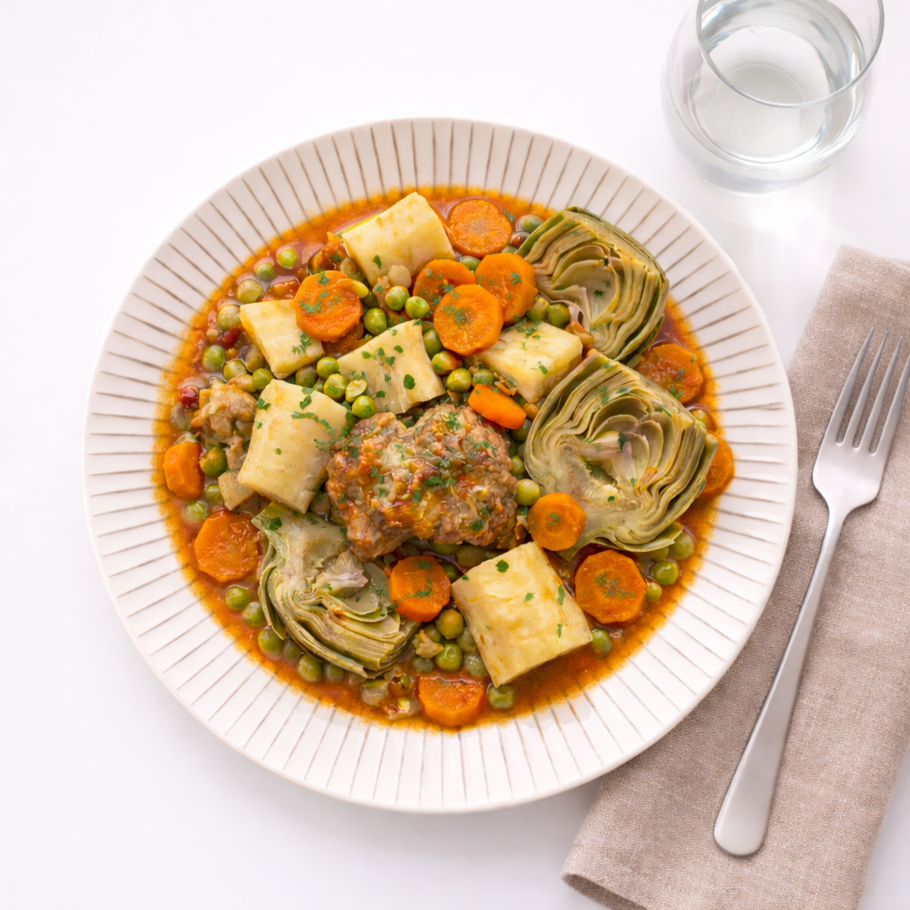 Cette jardinière repose sur un équilibre simple entre protéines, légumes et lipides de qualité. Le concentré de tomate revenu dans l’huile d’olive développe naturellement l’umami et intensifie la couleur sans alourdir la recette. Les légumes racines apportent fibres et satiété tandis que les petits pois complètent l’apport végétal en douceur. Le résultat est un plat nourrissant, riche en protéines et parfaitement compatible avec une approche culinaire IGBAS.