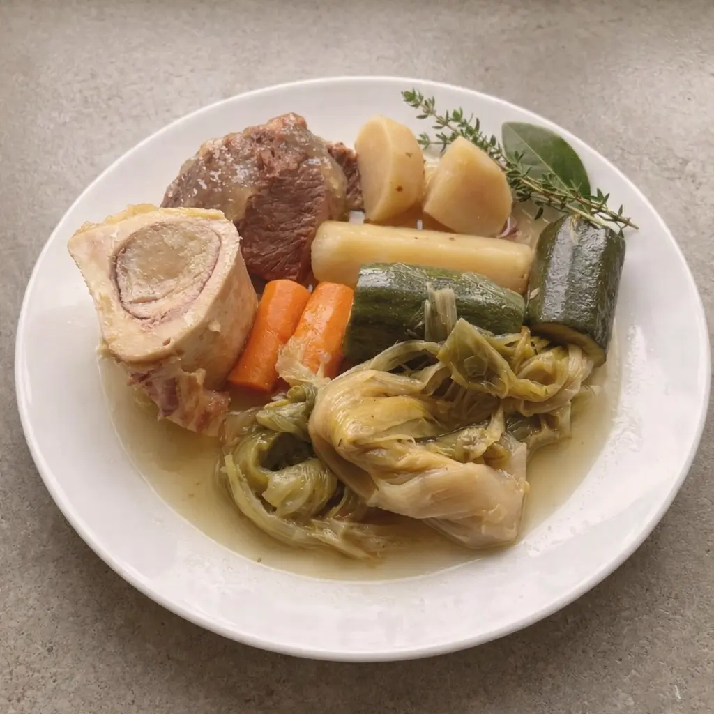 Ce Pot-au-feu maison est l’un des plats les plus emblématiques de la cuisine familiale française. La viande mijote lentement dans une eau froide parfumée aux herbes et aux légumes, ce qui donne un bouillon clair et riche en goût. Les légumes cuisent ensuite dans ce bouillon et deviennent fondants. Dans cette version, plusieurs morceaux de bœuf sont utilisés pour apporter différentes textures et un bouillon encore plus savoureux.